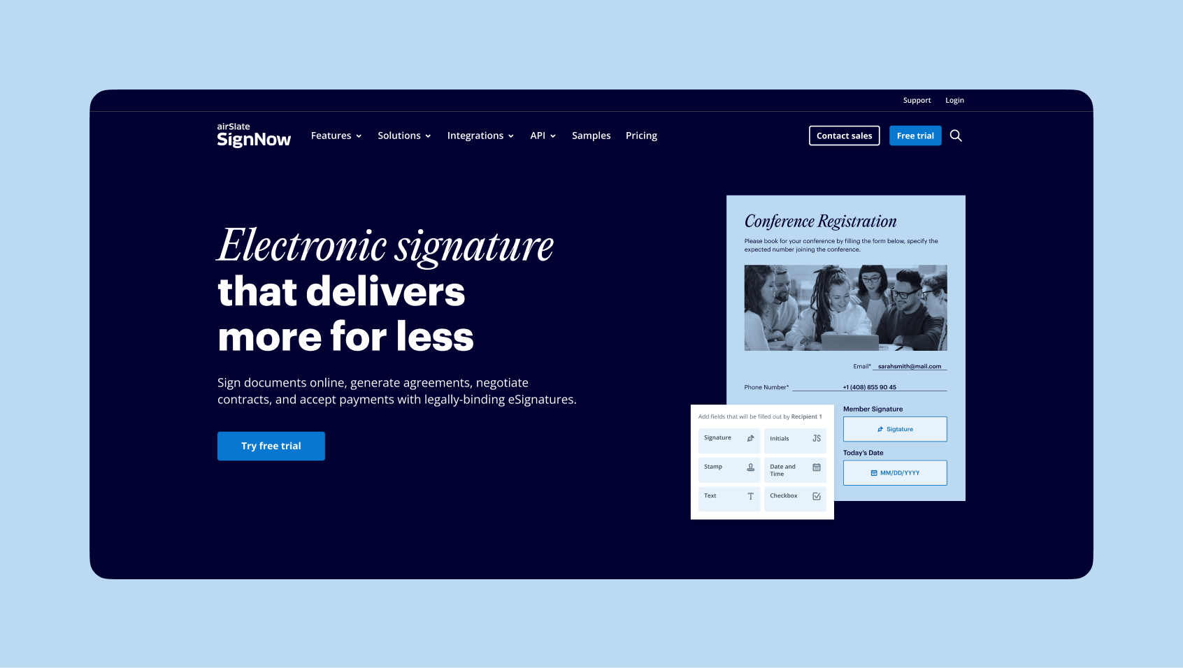 SignNow is an eSignature platform that is part of the airSlate ecosystem. It helps businesses of all sizes automate document signing, integrate eSignatures into their workflows, and stay compliant with security and legal requirements.